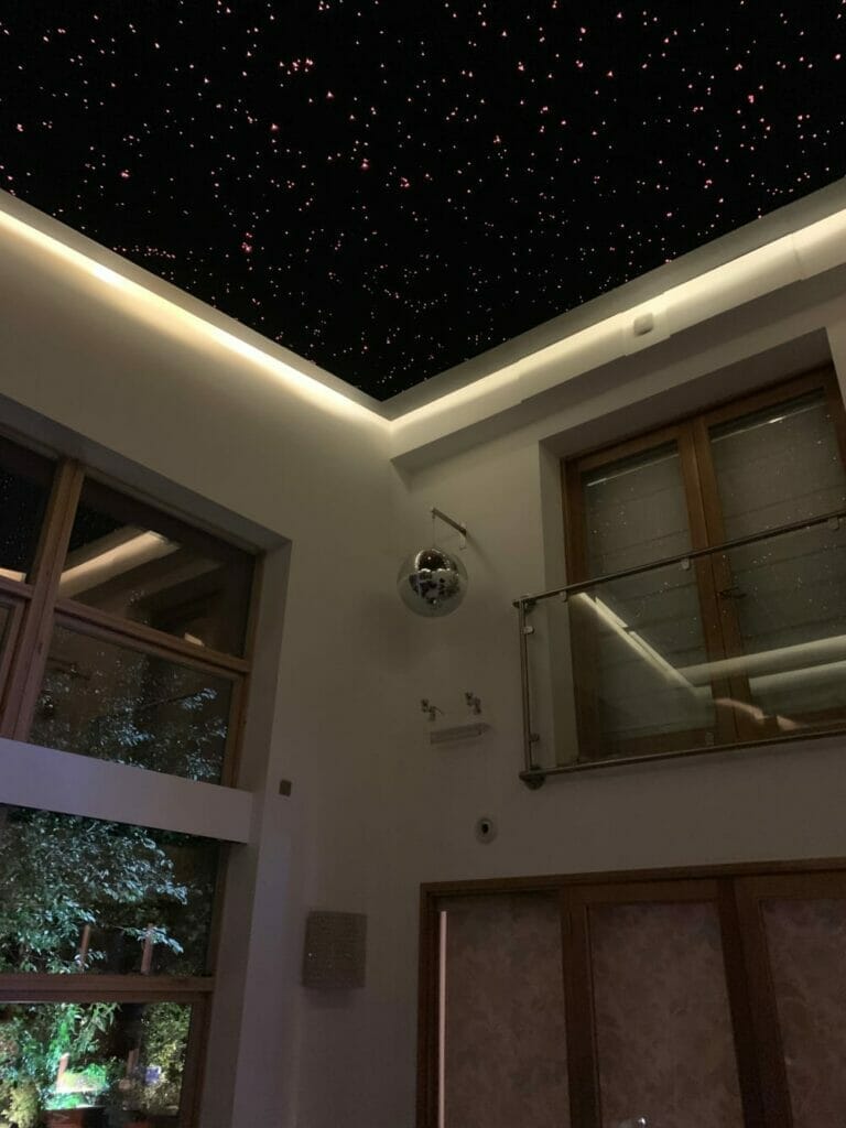 Starscape’s Infinity star ceiling panels are chiefly aimed at the home cinema sector, where the addition of a gently twinkling star ceiling helps to create that special ambience which makes movie watching into an event, rather than just part of daily routine. Home cinemas are bit womb like – dark, isolated and enclosed – deliberately isolated from the rest of the house and the outdoor world. However, in this project the star ceiling is part of a room designed to deliberately embrace the outside – to create a transition between the outdoors and interior of the house.